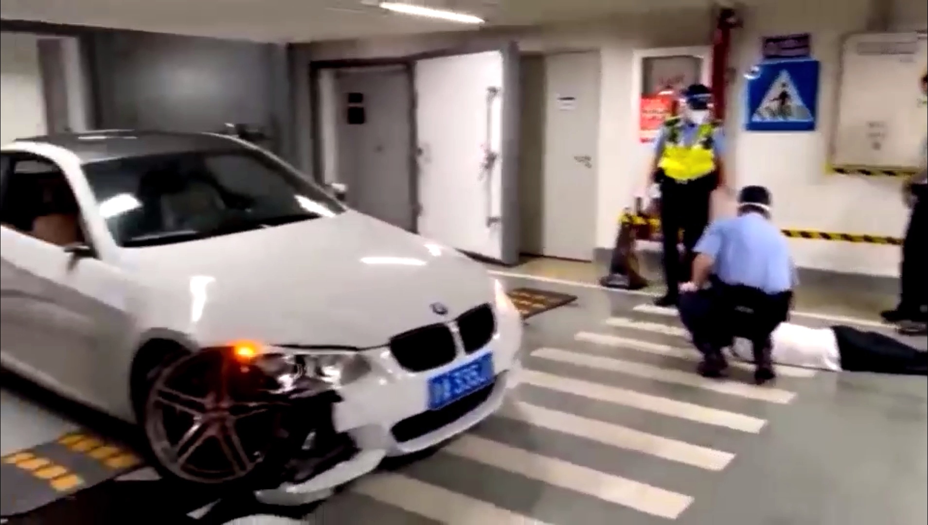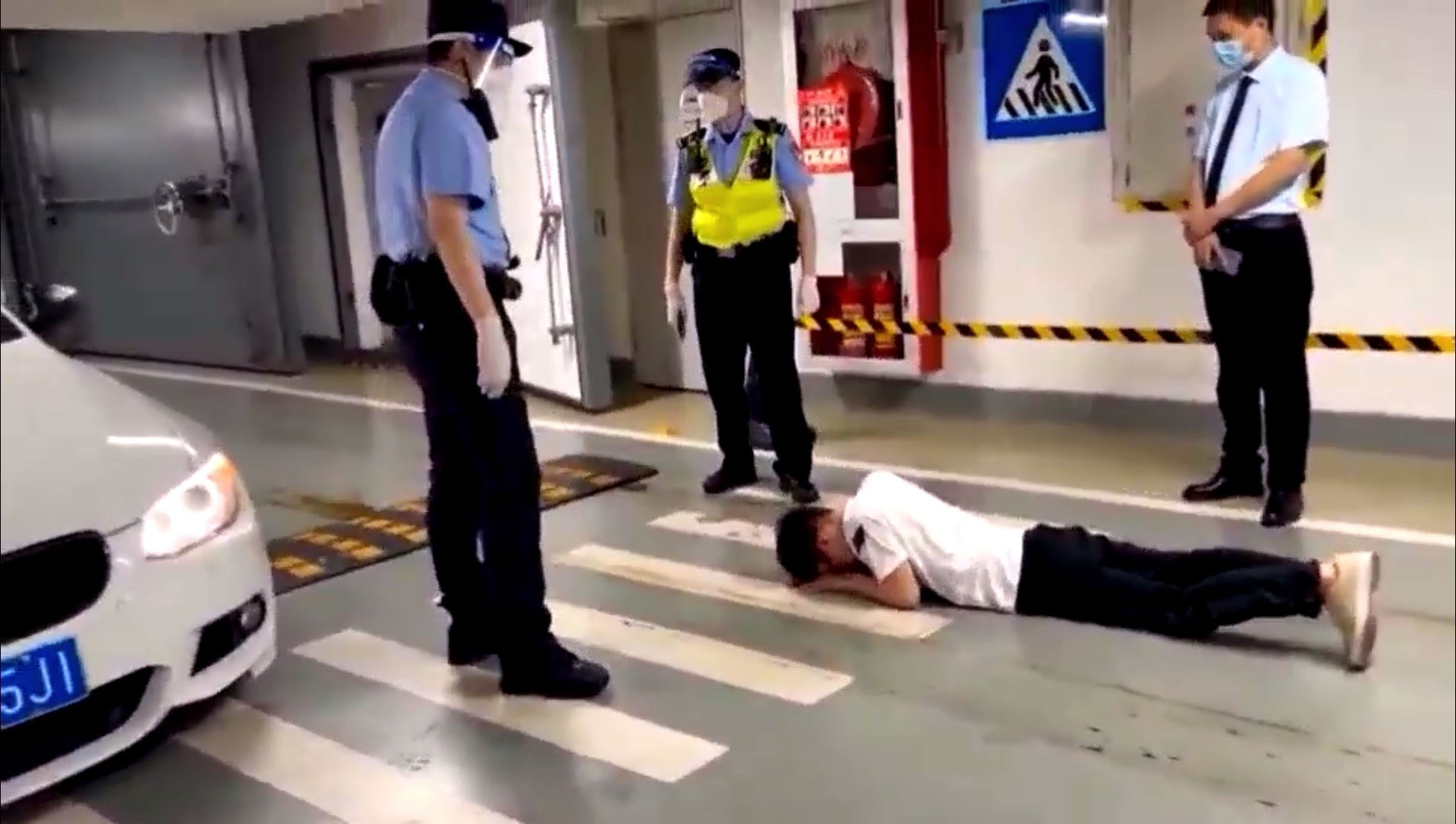 根据现场拍摄的视频显示,民警到达现场时罗某倒在地上不省人事,民警对他呼唤好久他依旧没有反应。其驾驶的白色轿车停在车库道路中央,右边的大灯和保险杠已经完全损坏,由于撞击还损坏了发动机,地上满是流出的黑色机油,右边的两扇车门也已经严重变形。民警好不容易将他叫醒之后,满嘴酒气的罗某还像没事发生一样想要自行开车离开。
