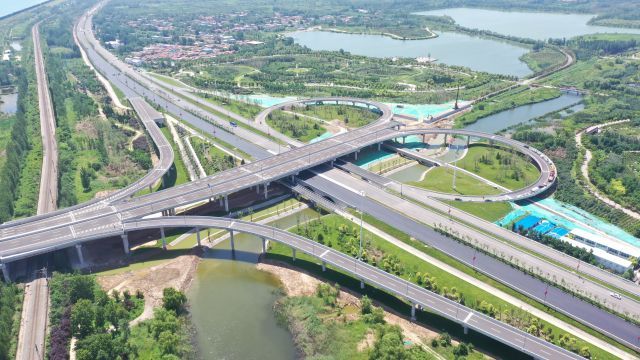 济南起步区互通立交桥工程既是起步区建成的第一座最大互通立交,同时也是起步区第一座跨铁路项目。互通立交桥对打破起步区现有道路的平面化限制,形成上下贯通的立体化交通发挥着重要作用,目前景观提升、引黄干渠改移及联通工程施工均已完成,形成了“黄、绿、蓝、灰”交相辉映的生态美景。