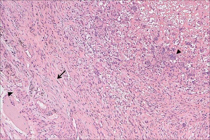 图3.组织病理:少量骨组织(左下三角),大量纤维组织(中间箭头),巨细胞(右上三角)
