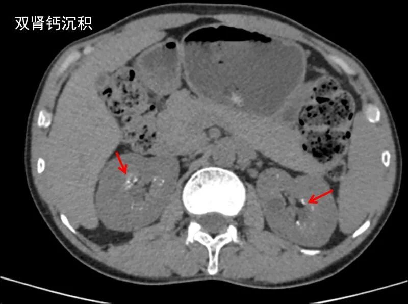 胸部CT可以查看到,部分上腹部可见双侧肾实质多发钙质沉着(图6),这是甲旁亢典型的肾脏表现。甲旁亢患者由于血钙升高和尿钙排泄增加,肾结石和肾钙质沉着的发生率明显增加,不明原因的肾结石、复发性或多发性肾结石应常规排除一下甲旁亢,一次血钙测定只需花5元钱,有可能早期发现甲旁亢。
