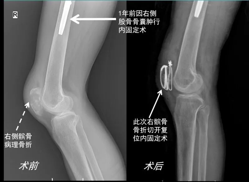 42岁的郝先生,不小心摔了一跤,虽然是臀部着地,但伤后却出现右膝肿痛和活动受限,于金山区亭林医院急诊拍片显示右侧髌骨骨折(图1),遂住院接受了右侧髌骨骨折切开复位内固定术(图2),并留取了活检标本,看似非常普通的一个病例,已经准备出院了,这个简单的故事,似乎一开始就马上要结束了。