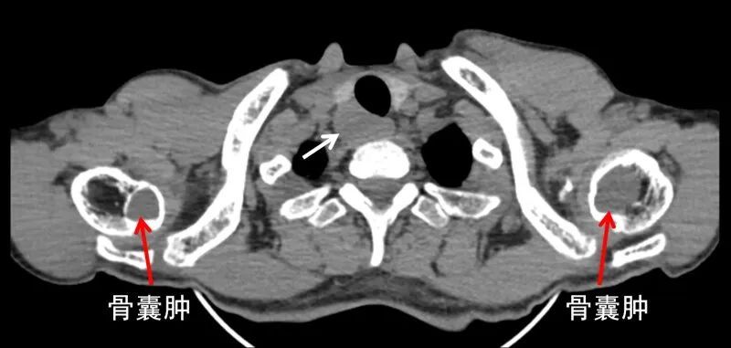 图4.胸部CT:右侧甲状腺背后甲状旁腺腺瘤(白箭头),双侧肱骨骨囊肿(红箭头)