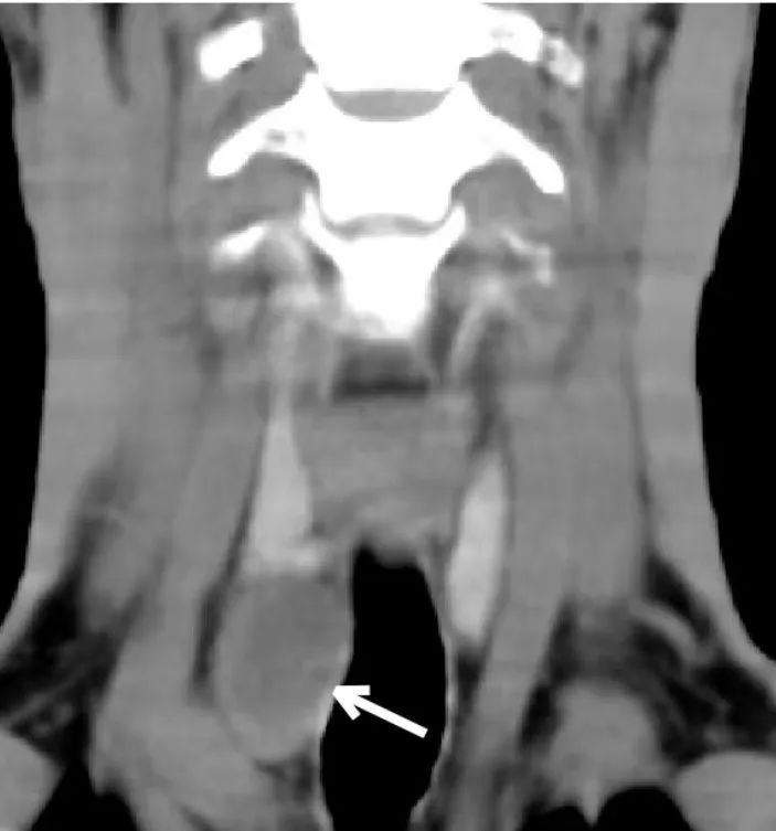 查看胸部CT横断面,可以看到双侧肱骨骨囊肿形成,同时还可以看到右侧甲状腺背后存在一个很明显的低密度软组织肿块(图4),这个才是真正的罪魁祸首,正是这个隐藏很深的甲状旁腺腺瘤持续分泌超高水平的甲状旁腺激素(PTH)引起一系列临床表现。