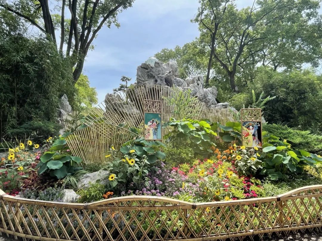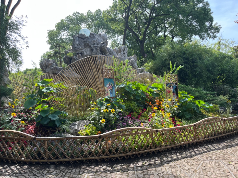 景点以假山为背景,布置了向日葵和荷花,在竹扇光影的映衬下,荷花荷叶簇拥着瓷板画国粹,而向日葵衬托着“主角”们,欣欣向荣又富有韵味。微风袭来,荷花仿佛穿着粉裳翠裙翩翩起舞,向日葵似乎闪烁着金光,给人一种置身江南水乡的感觉,惬意感油然而生。