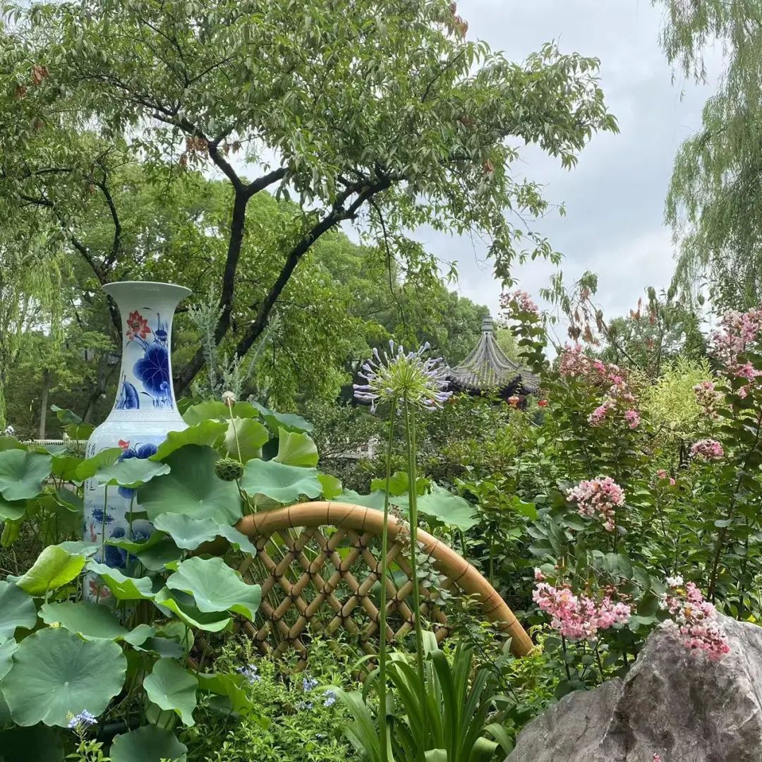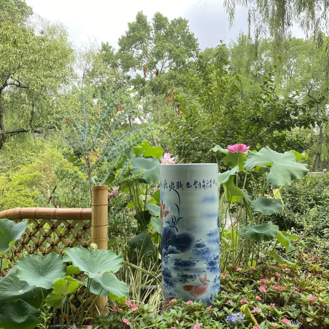 诗中描述了上海古猗园九曲桥南侧新布置的景点。景点背倚广阔的鸳鸯湖,借景贯穿湖上的九曲桥,增添了荷花主题的青花瓷瓶、竹篱笆等富有中国传统元素的小品,点缀红粉白黄色的荷花,打造出一处新的园区景点打卡点。