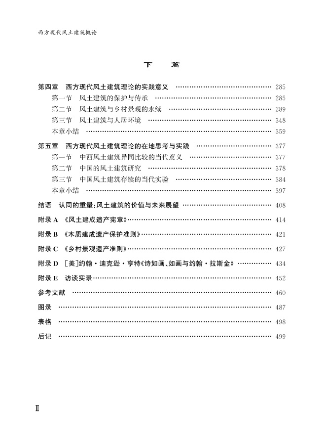 在结语部分,从“以实证为基础考察风土演进史实,初步梳理了西方风土理论和实践文献”“以当代风土问题与解决途径为问题意识,诠释和拓展价值认知和保护策略”和“以国际视野逐渐切入中外比较语境下中国风土建筑遗产存续问题的解析”三个方面概述了本书的研究结论和探索方向,对风土建筑的价值与未来存续方式作了展望。