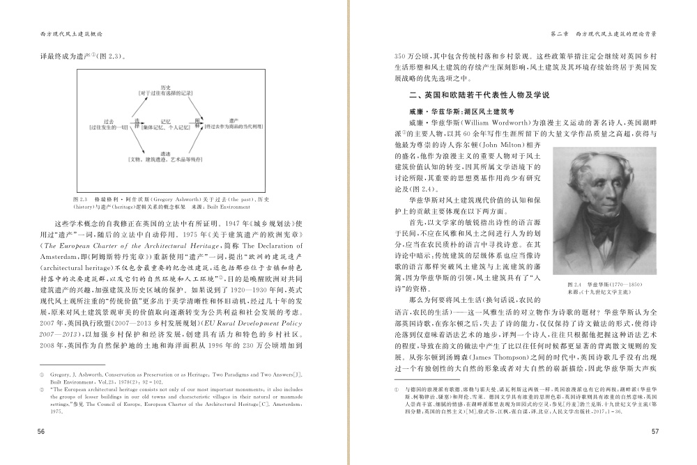 第二章是西方现代风土建筑的理论背景。首先,从探寻早期风土观转变原因的角度出发,考察风土观与民族国家的关系,以英语词源的王室与乡绅结盟背景为例,指出西方政治格局的二元结构,解释西方社会风土建筑之于风雅建筑的整体社会基础。随后从风土观与文化地景的角度,论述了景观审美的价值取向,整合英国和欧陆若干代表性人物及学说,梳理出早期西方现代风土建筑的核心思想和理论类型。将西方风土观在日本的衍生和影响作了初步梳理,涉及了较早受到西方现代风土观念波动影响的日本现代风土建筑的研究理路问题。