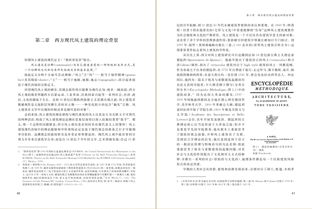 第一章是导论,梗概性地展示现代西方风土建筑观念的生成,回顾西方现代风土建筑代表性文本及其研究旨趣和学科分化,初步追溯西方相关研究者的问题意识和思考方法,并提出本书采用的研究架构。