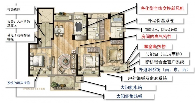 “在被动节能技术上,采用了高性能围护结构;主动增能技术方面,采用了分体式阳台太阳能热水系统与高层建筑一体化设计,采用燃气热水炉作为辅助热源,增加了户内热水循环系统和智能温度控制系统,保证热水的即开即用……”