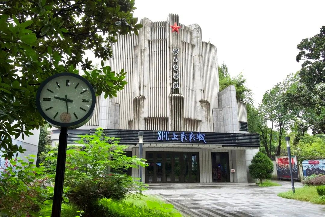 衡山电影院在外立面上引入竖状线条,充满装饰艺术风格,绿意葱茏中展现出一座雪白褶皱纹路装饰的“山形”建筑物,顶层一个大五星,下书“衡山电影院”五个大字。