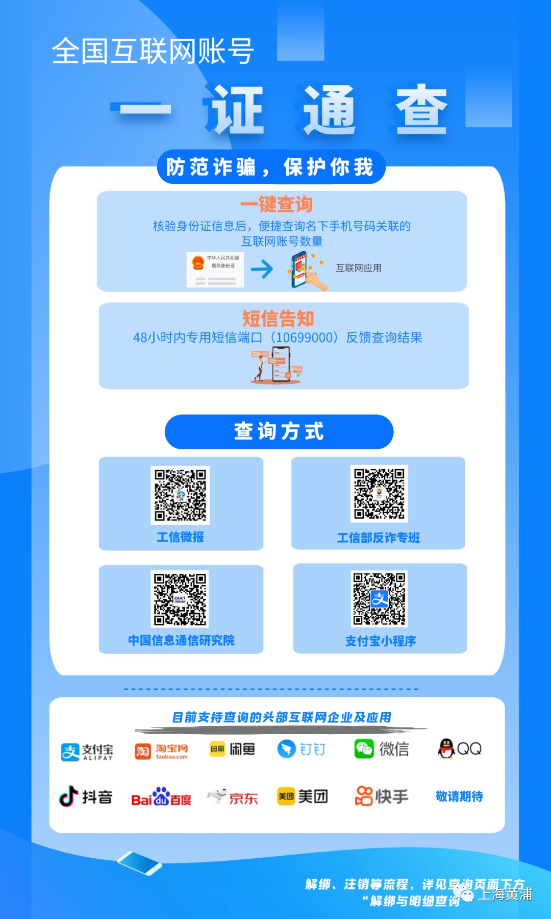 “一证通查2.0”是在工业和信息化部网络安全管理局指导下,由工业和信息化部反诈中心(中国信息通信研究院)在全国移动电话卡“一证通查”服务的基础上,联合互联网企业和电信企业推出的全国互联网账号便民查询服务。