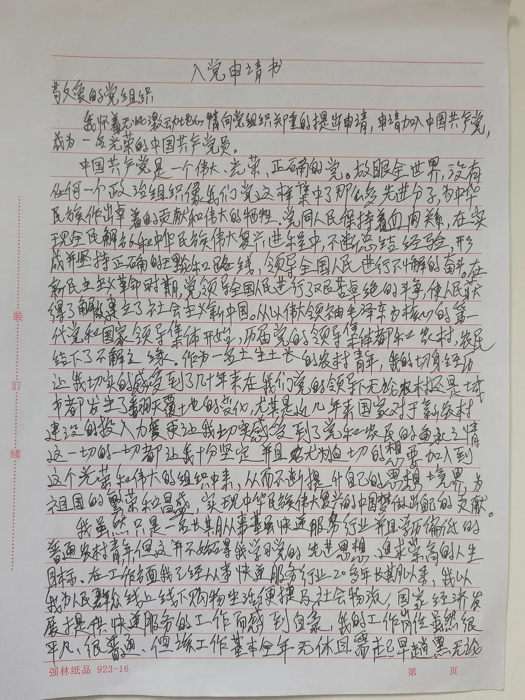 在疫情期间,看到了党组织的领导力和执行力,看到了党员志愿者关键时刻冲得上去的初心本色,“全国邮政行业劳动模范”申通快递员伍大兴正式向党组织递交了入党申请书。