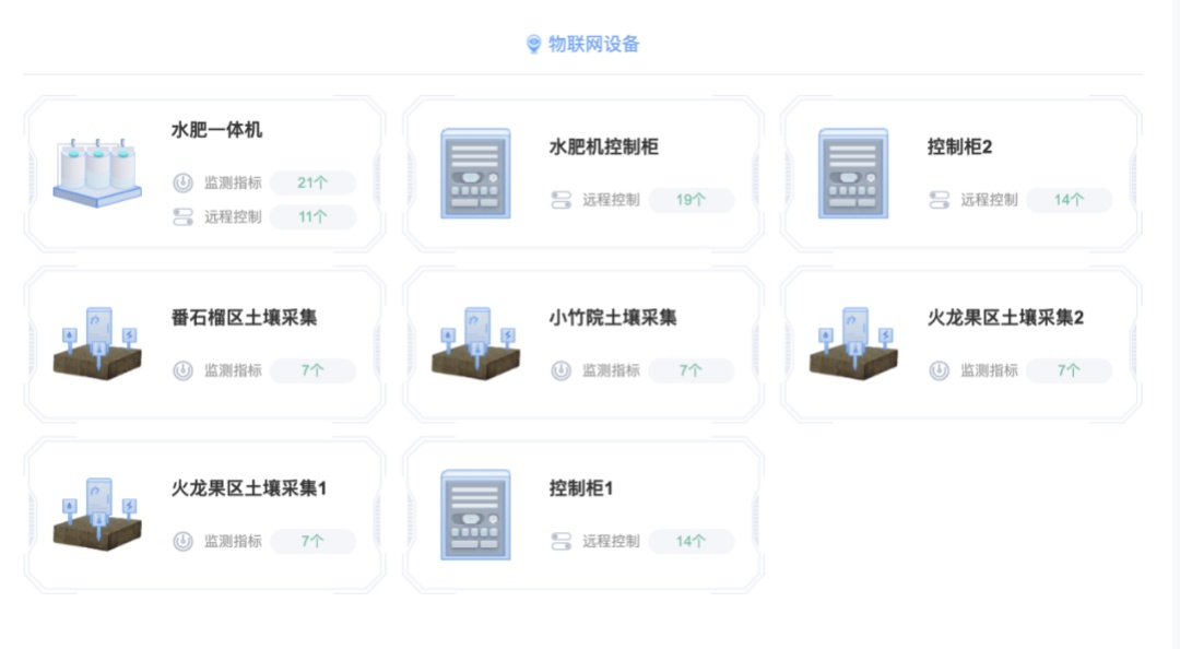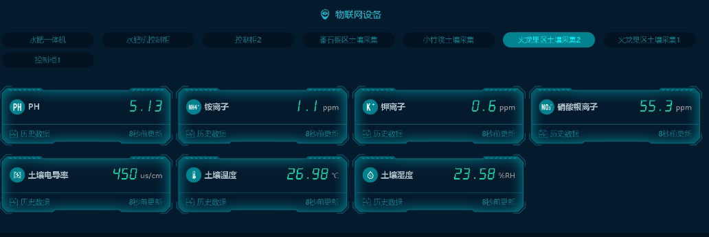 通过各类型土壤传感器实时采集基地土壤的pH、温湿度、电导率、钾离子、硝酸根离子、铵根离子等土壤信息,当农户发现数据异常时可及时进行人为干预,以提高作物的长势和产量。