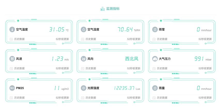 实时采集基地气象数据,包括温湿度、风速、风向、降雨量、气压、光照等等数据,实时了解基地的气象情况。