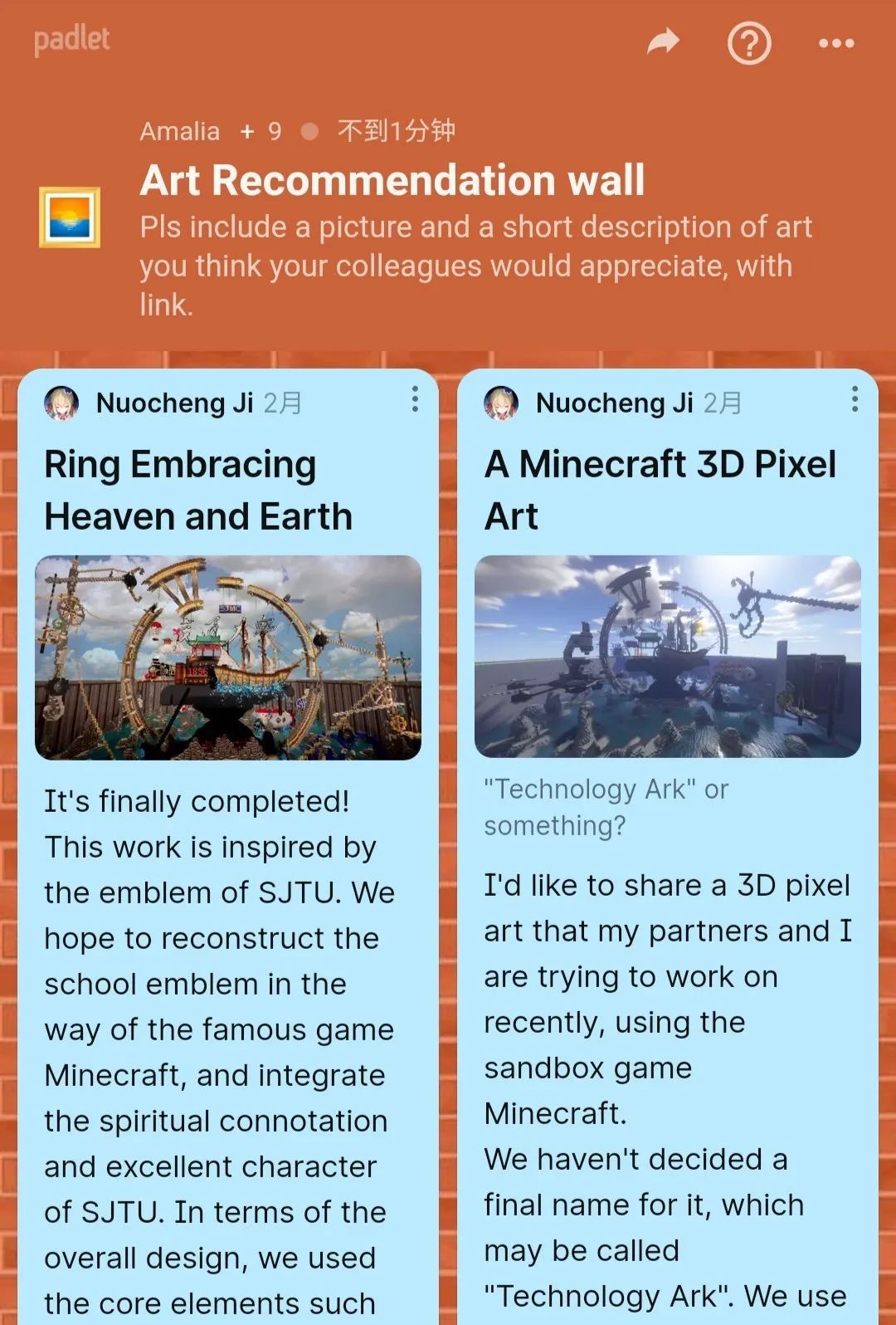 密院教师Amalia Jiva的艺术分享墙上,季诺澄展示Minecraft作品