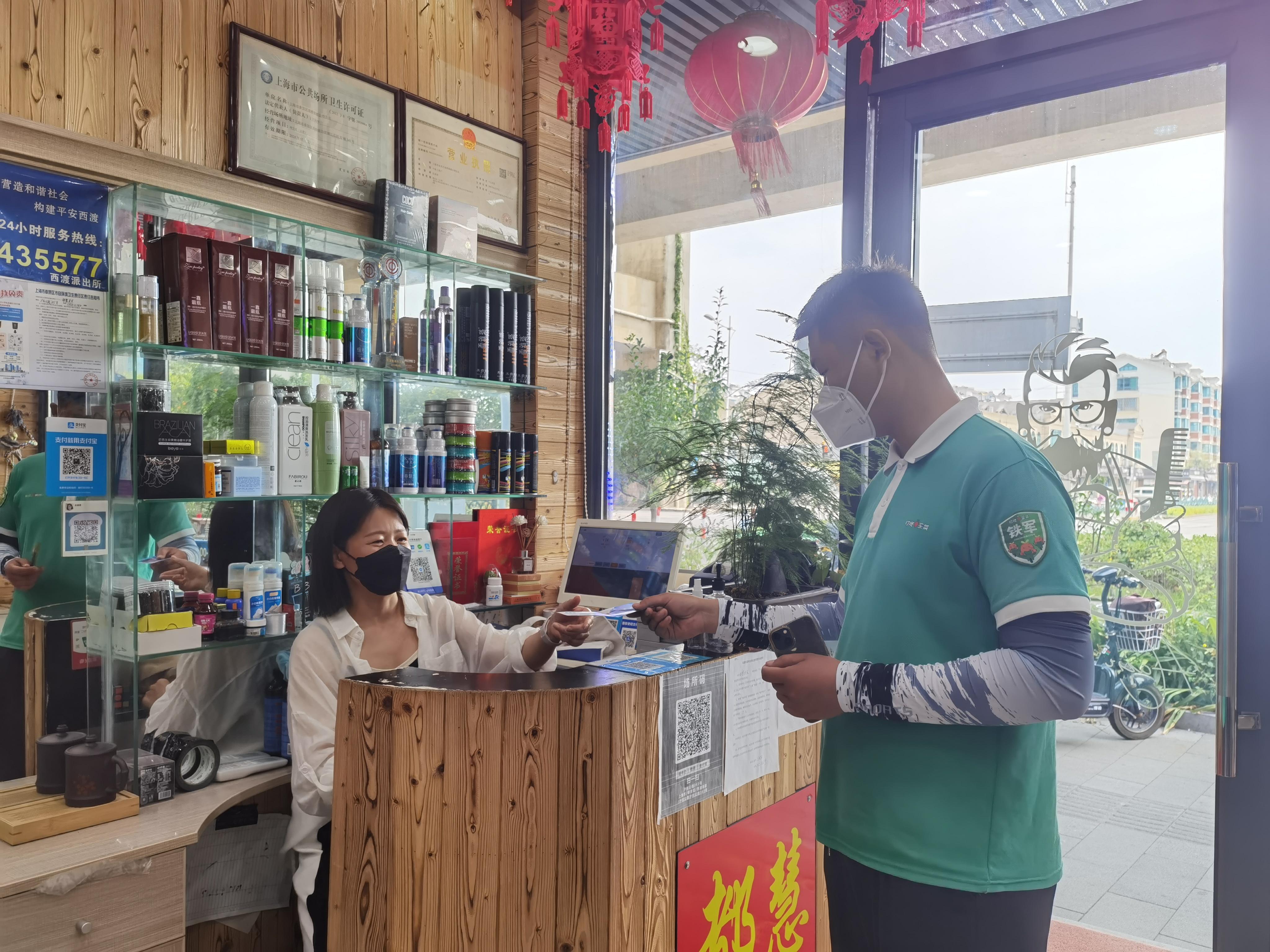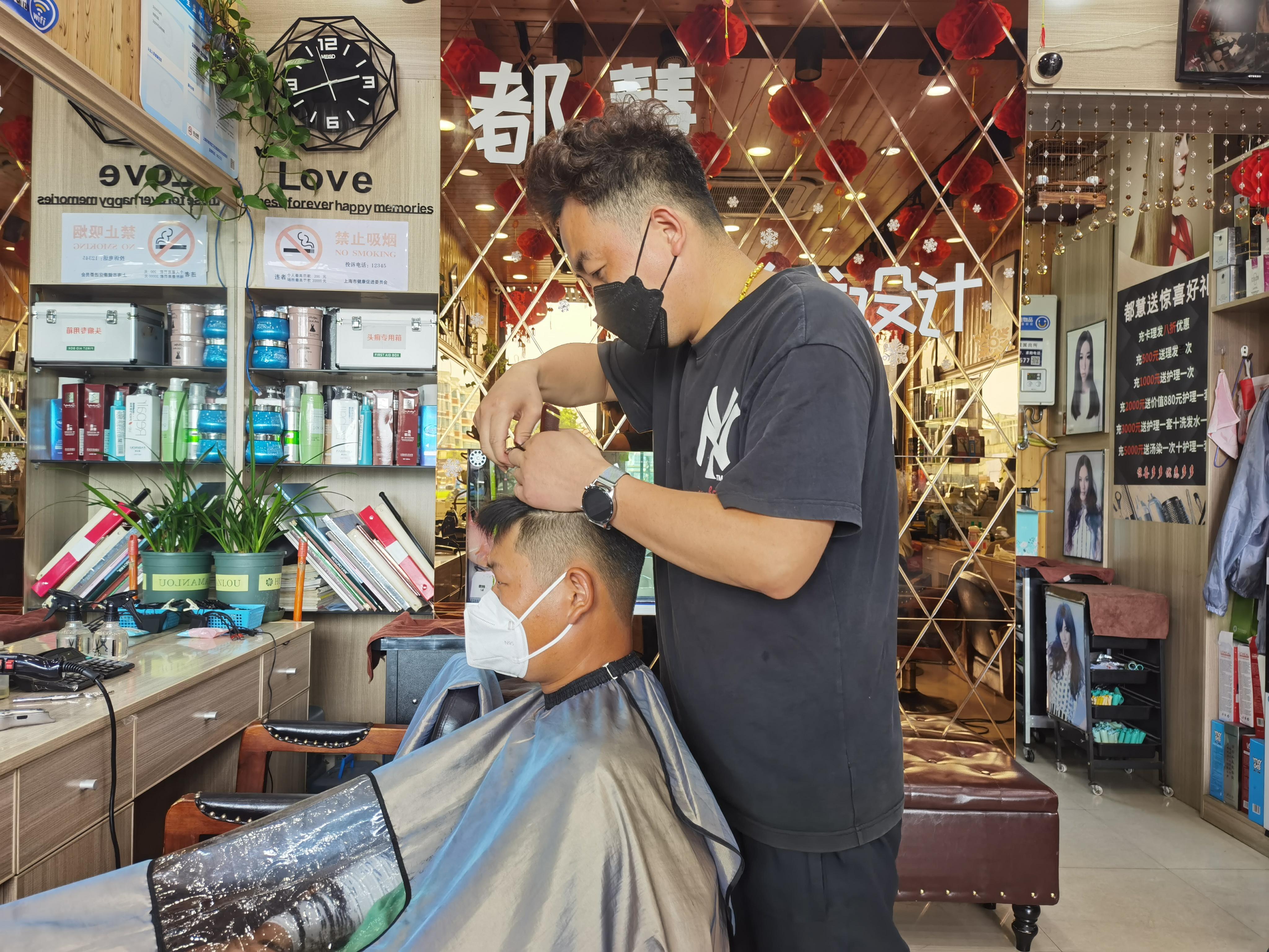 而在相隔不远的都慧理发店,理发师闫保君也正在为一位叮咚买菜的骑手细心地修剪头发。同样,在理完头发之后,店长也收到了一张蓝色骑士理发抵用券。 “平时他们理发一般都是35元或者 40 元,他们拿了券过来理发,他们得到实惠了,我们也很满足。” 闫保君表示,自家理发店已经在当地开了二十多年,平时外卖小哥来找他理发也不少。