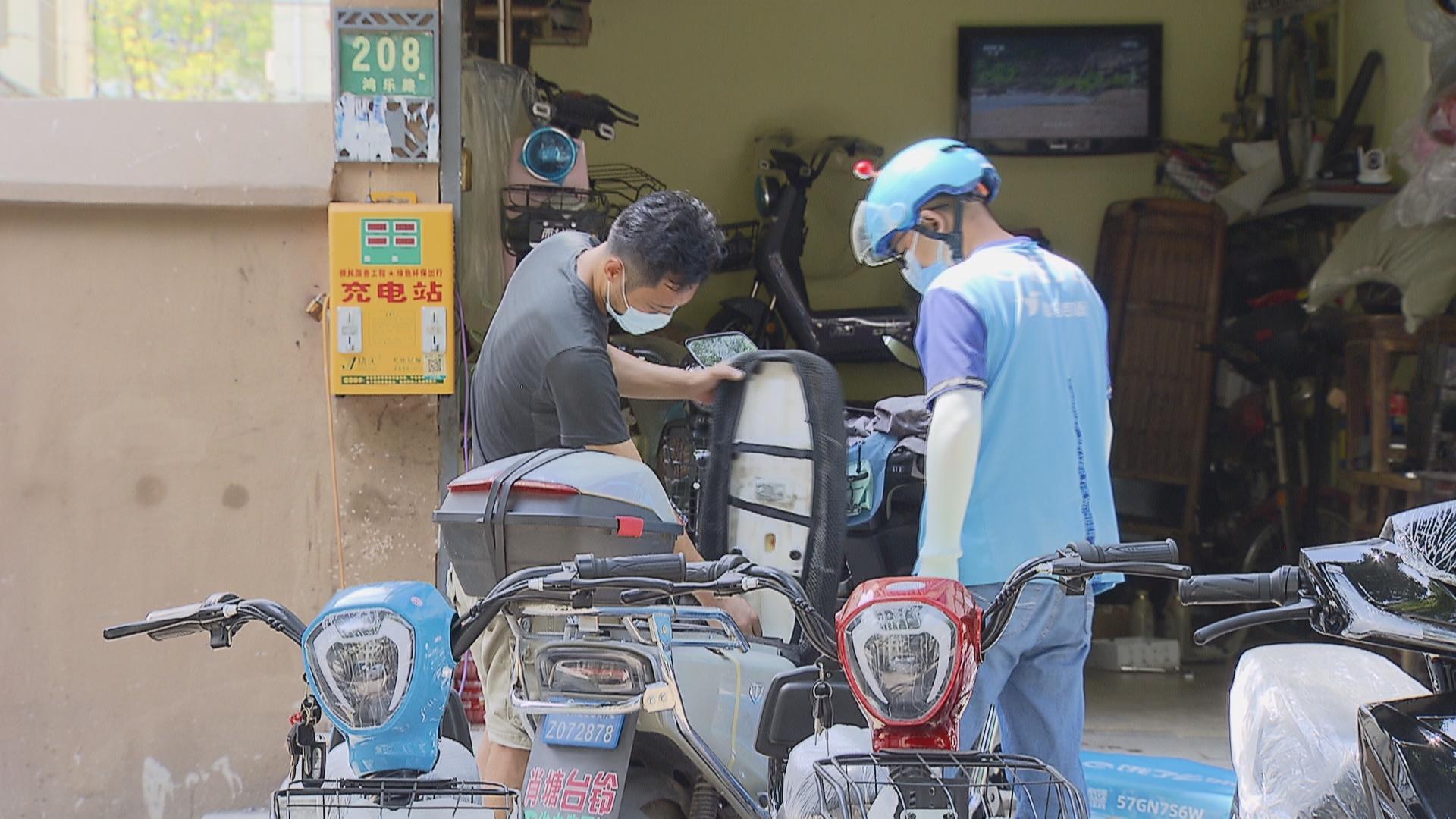 7月16日,在西渡街道鸿乐路的乘鹿车行,外卖骑手小陈正在和店主吴阳德沟通助动车出现的问题。这几天他总觉得车辆启动不顺畅,趁着中午送餐高峰告一段落,他赶紧来修车铺解决问题,等会儿还要忙着继续去接单。店主吴阳德仔细检查了车况,发现是线路接触不良造成的,五分钟快速解决了问题,还帮轮胎打了气,提醒他夏天注意轮胎情况。没想到这么快就完成了维修,小陈兴高采烈地递上了一张蓝色修车抵用券。