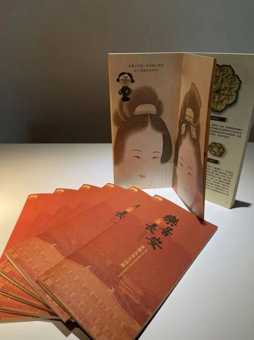 乐居长安展览宣传册除涵盖整个展览的重要内容、器物介绍外,还兼具打卡集章、面妆DIY等展览互动项目,是一本能够让观众带走的展览文创。