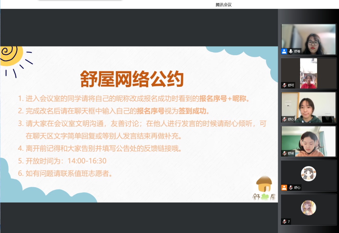 今年3月,疫情中止了“舒屋”的线下活动。李晓茹分析了青少年在居家封控期间的心理需求,将“舒屋”转到线上,开启了“云舒屋”聊天室。孩子们可以在网上提前预约“大群畅聊”或“一对一私聊”模式。每天上下午固定时间段,都有志愿者们在腾讯会议中与孩子们互动。