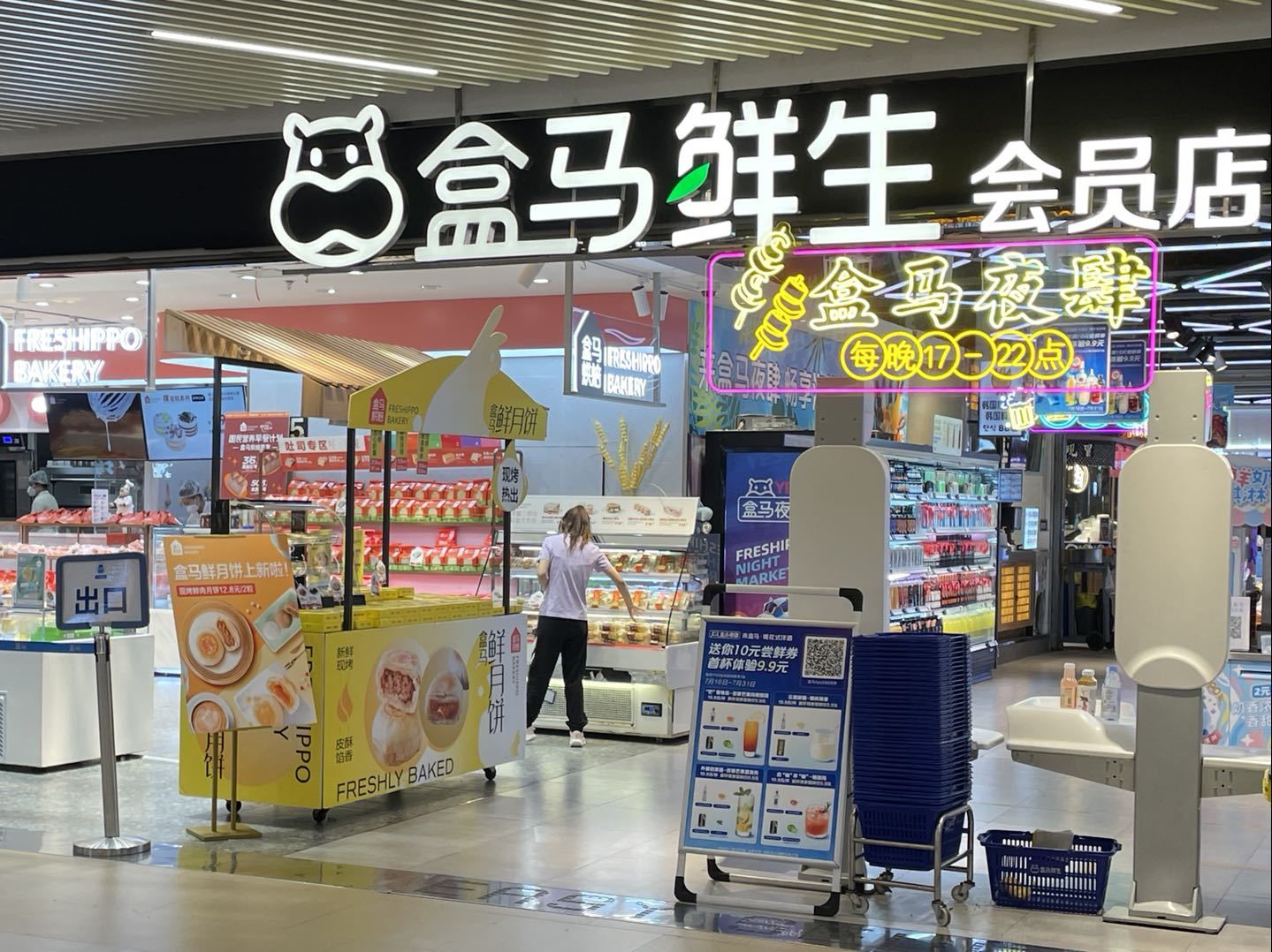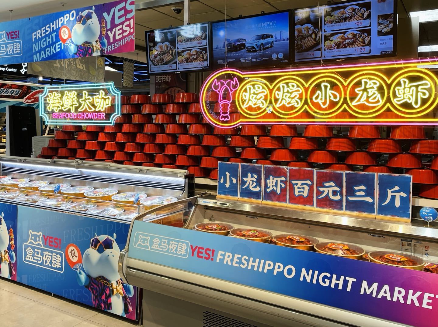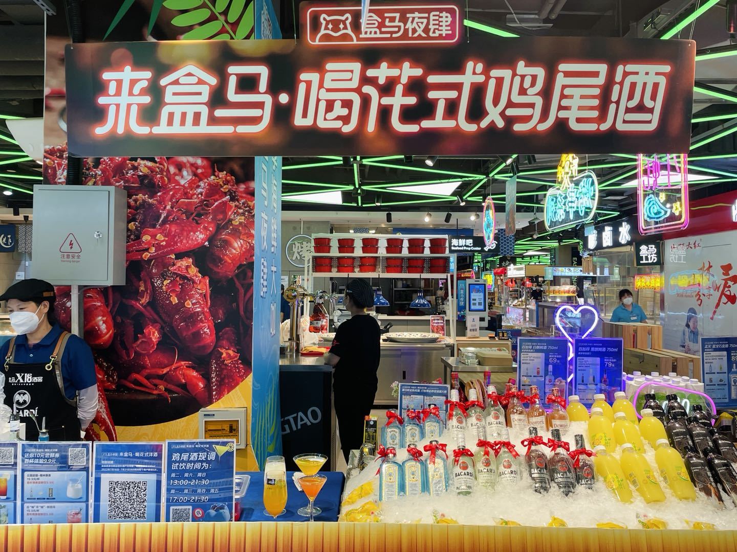 入夏以来,家住静安区大宁路的房先生在逛街时发现,大宁音乐广场的盒马变样了,入口多了一块“盒马夜肆”灯牌,餐食座位区多了五颜六色的鸡尾酒、烤串、小龙虾、海鲜,“感觉像在逛夜市,逛逛吃吃,夏日氛围感十足。”