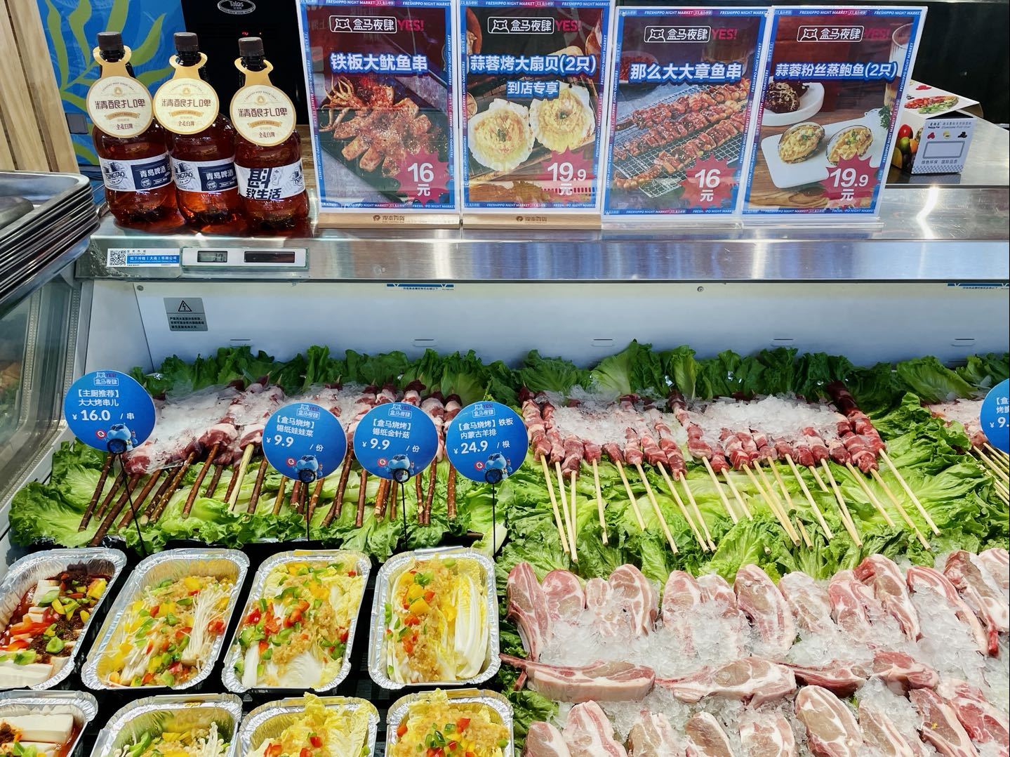 在大宁音乐广场店,记者看到,餐食区划分了盒马精酿、海鲜大咖、炫炫小龙虾、烧烤等区域,整齐陈列着各色牛排、海鲜拼盘、小龙虾神鲜桶、精酿鲜啤、红柳枝羊肉大串、烤鱿鱼、百香果凤爪、凉糕等美食,令人应接不暇。