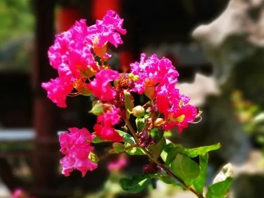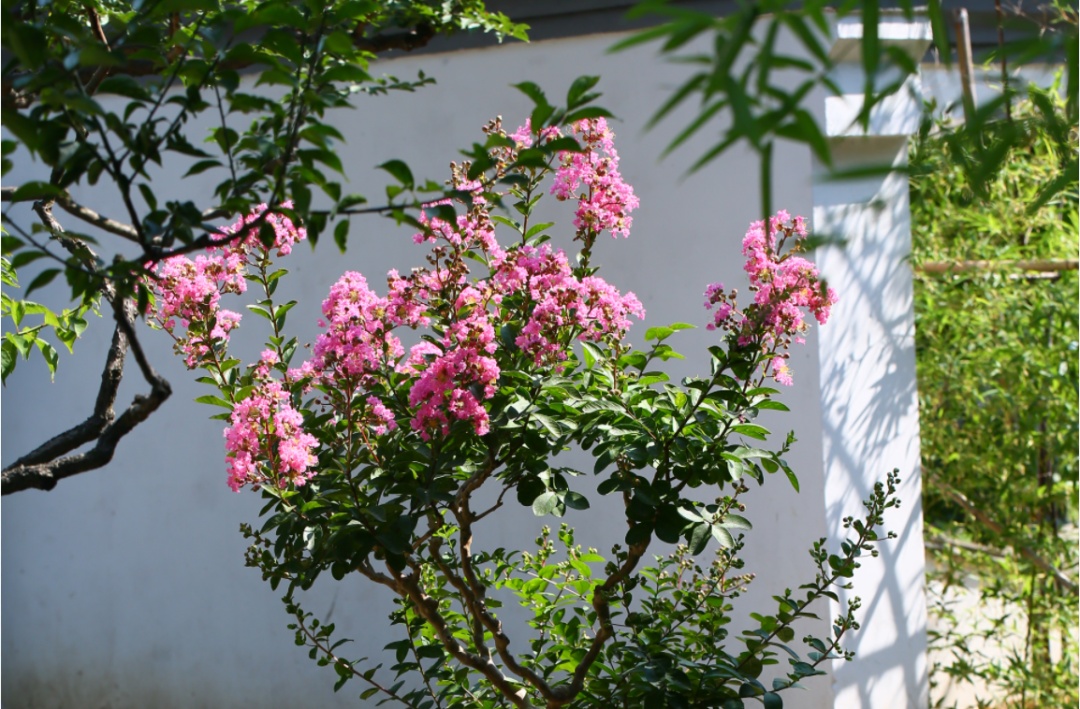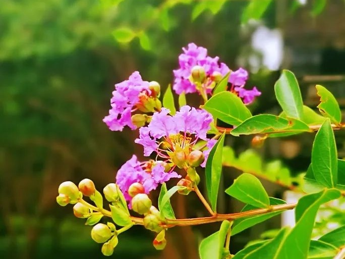 水红、深红,玫红、大红、深紫、浅紫、粉色和白色构成了紫薇丰富的色系,也让紫薇花美的无与伦比。在绿意盎然的叶片衬托下,紫薇花开的热情,开的柔美。