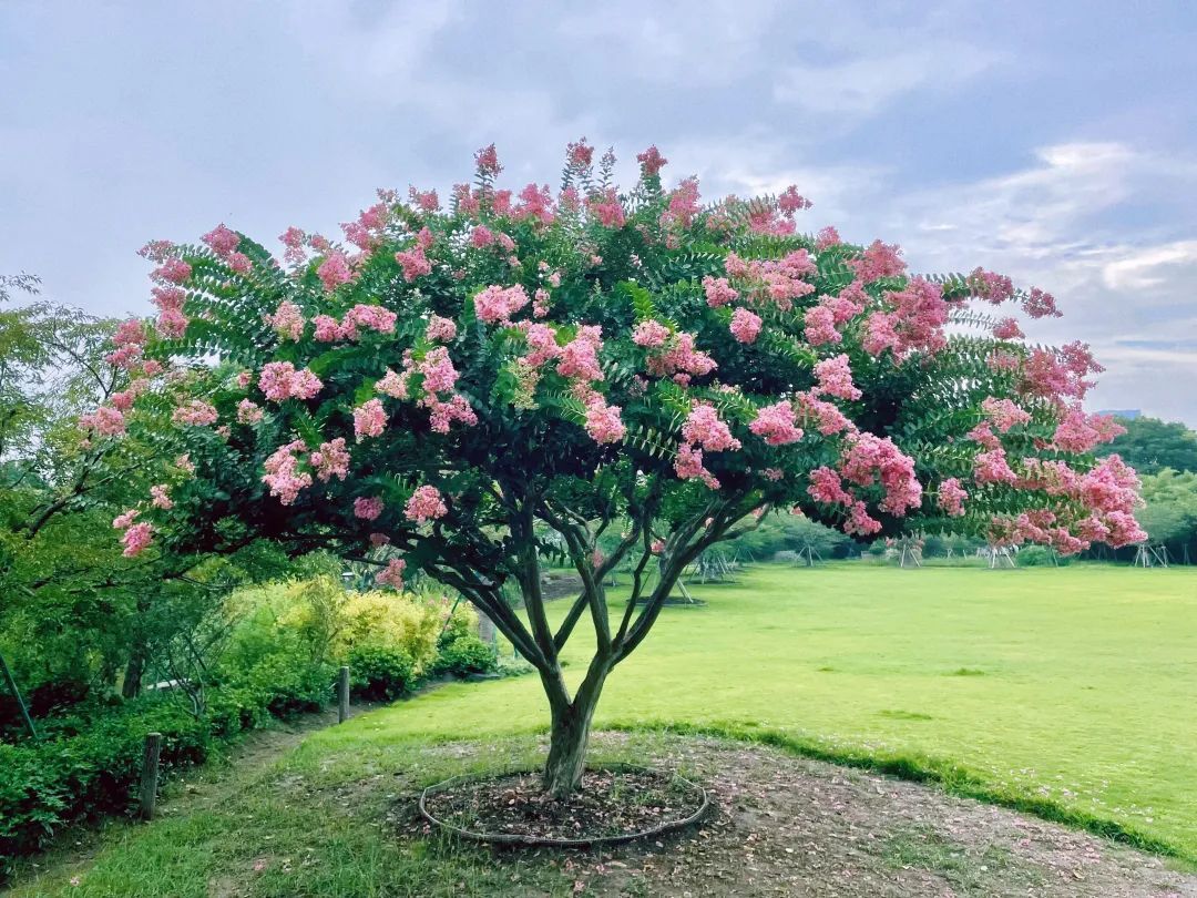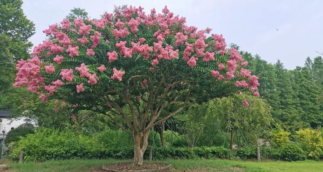 上海植物园有一株紫薇花冠压群芳,通过养护专家的多次修剪留养,形成了一个宽阔的略有弧形的整齐棚面,从而保证了每个枝头新梢萌发和生长的一致性,最后每枝花芽也几乎同时进入花期,从而形成了这种类似花伞的观赏效果。