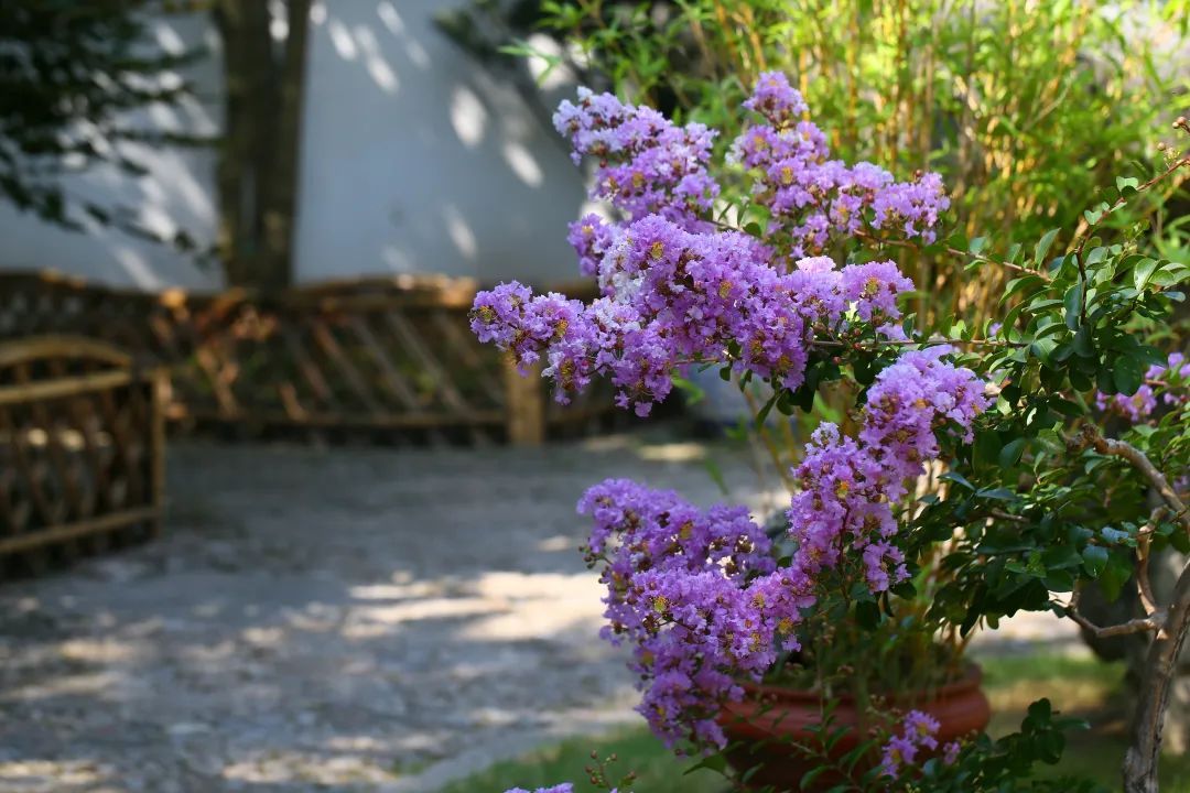 在古猗园盆景园中,两盆紫薇盆景树姿端雅、奇特、古朴,花开正欢。紫薇花是圆锥花序,其花瓣带着蕾丝边,通过细细的花梗与基部相连,一朵朵紫薇像祥云一般,随着微风一舒一卷。