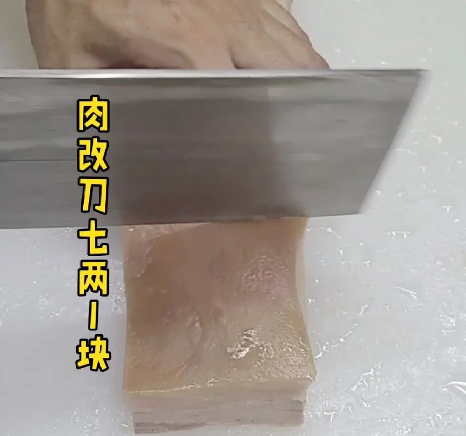 ·蒸制完成后的五花肉已经定型,切出的肉块外形更加规整,将五花肉放凉后,在表面切十字花刀便于入味