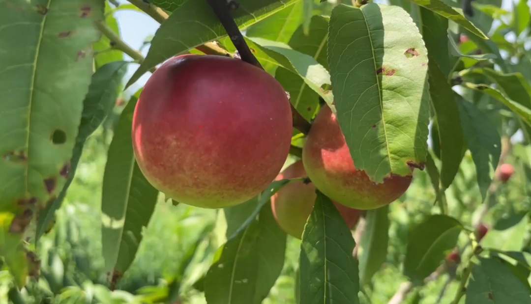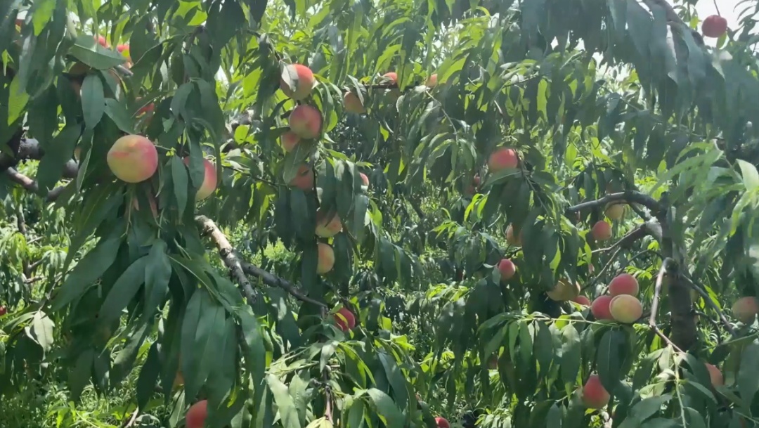 而在不远处,一个个白里透红、圆润饱满的水蜜桃也已挂满枝头。由于今年气温高、雨水少,水蜜桃的长势不错,口感也比往年更甜,凑近果树,阵阵桃香扑鼻而来,令人“桃”醉。