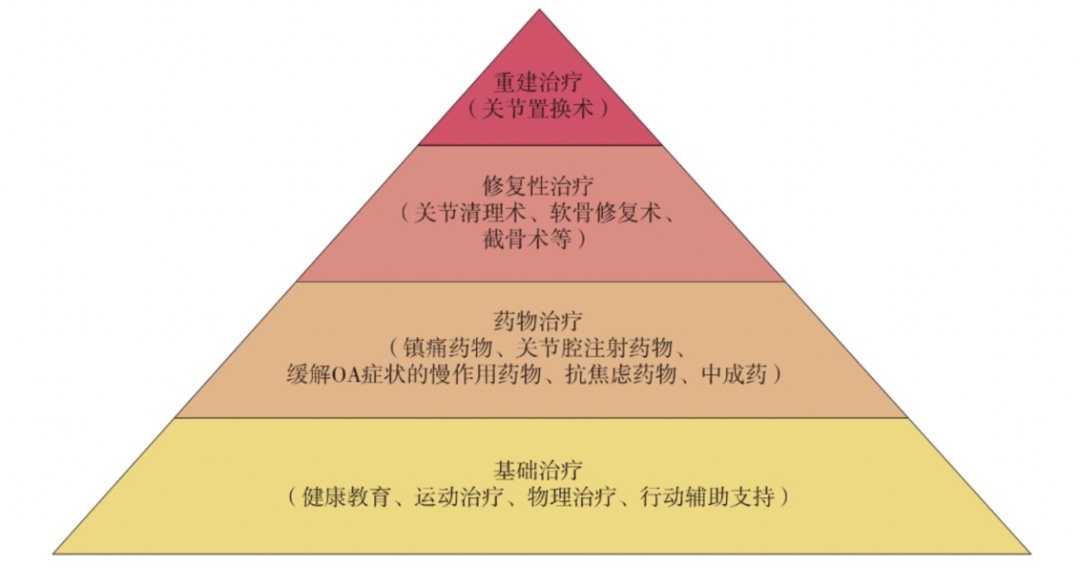 骨关节炎的治疗讲究个体化的阶梯治疗。早期的基础治疗,包括:改善生活习惯、避免长时间跑跳蹲、减少爬楼梯爬山、控制体重、关节保暖、适当肌肉关节锻炼、使用拐杖支具等。若基础治疗缓解不明显,可上升至第二阶梯药物治疗,包括:局部外用药物、口服镇痛药物、关节腔注射药物、缓解OA症状的慢作用药物、抗焦虑药物、中成药等。若仍旧治疗效果不佳,则推荐第三阶梯的外科修复性手术治疗,包括:关节清理术、软骨修复术、截骨术、关节融合术等。对于终末期的老年骨关节炎患者,基础治疗、药物治疗效果不佳,则考虑行人工关节置换术。目前以全髋关节、全膝关节、膝关节单髁置换术应用最为广泛,技术成熟,治疗效果肯定;而肩关节、肘关节、踝关节置换术等在临床上也具有一定的适用性。