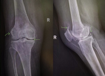 这是膝关节骨关节炎典型的X线片,上图箭头所示右膝内侧间隙较外侧间隙明显狭窄,软骨下骨硬化;股骨、胫骨平台、髌骨上级边缘有增生的骨赘;侧位片显示关节后方有一枚关节内游离体。