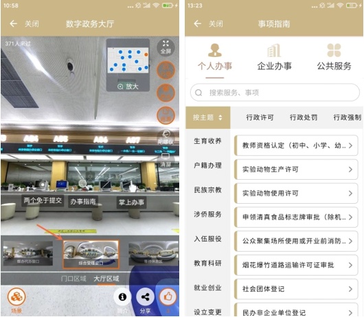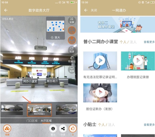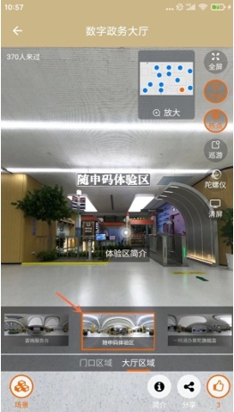 数字政务大厅场景与分组里的每项设施都与实体大厅一一对应,通过场景切换可直达各服务区域。目前展示的是一层大厅服务区域,其中包含了24小时自助服务区、咨询服务台、随申码体验区、政务公开服务区、综合受理窗口、帮办代办窗口以及自有的普陀政务直播间等,为市民提供服务简介、办事指南、服务内容等信息,从而构建起一个集访问、浏览、查询等多种功能于一体的移动端虚拟政务服务大厅。