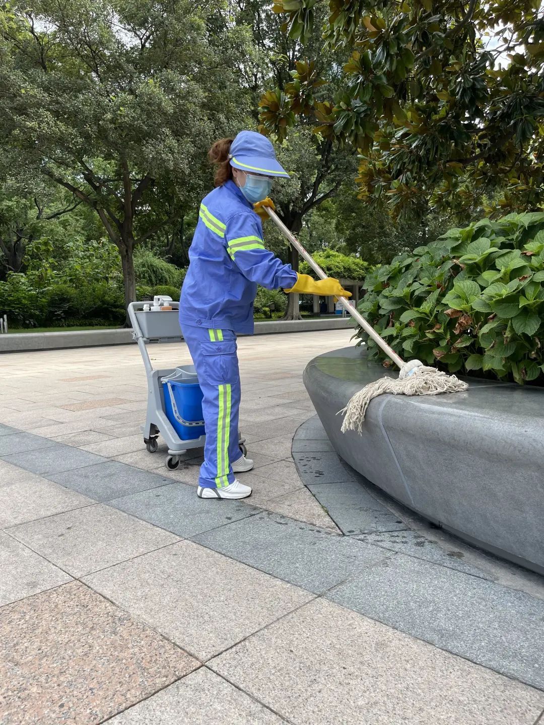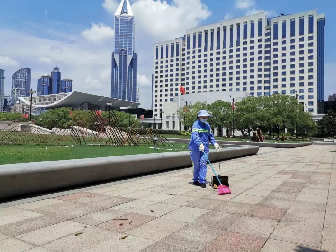 日头越升越高,气温也来到38摄氏度。原兰英已是满头大汗,工作服渗出的汗渍越来越明显,但她和所有保洁员都还在继续来回走动作业。