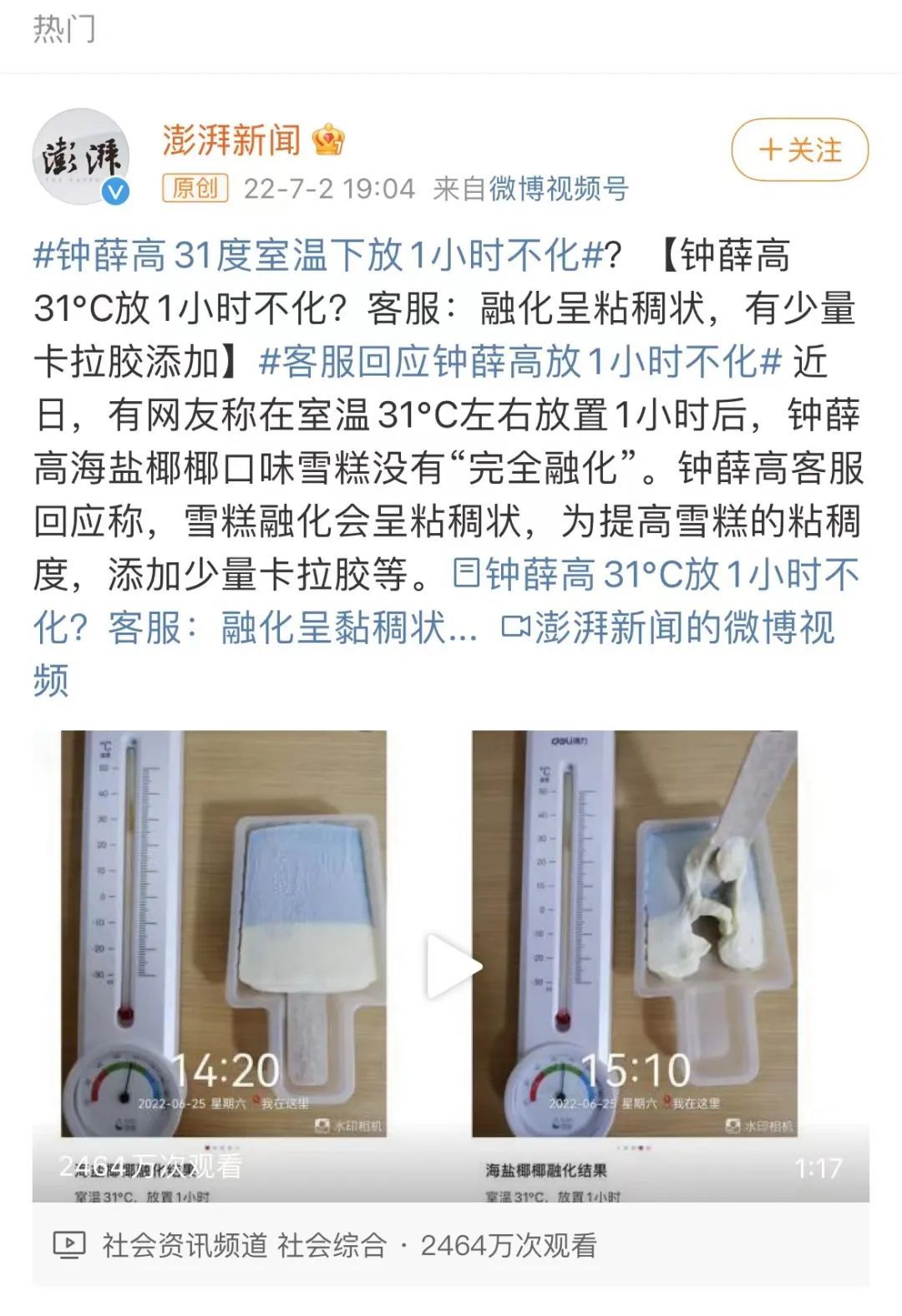 近日,一款网红雪糕在31℃的室温下放置近1小时后仍然没有完全融化,甚至有网友用打火机点燃它仍烧不化,引发广泛讨论。要知道,用“日晒或者加热雪糕”的方式来评断雪糕品质好坏,这不科学!