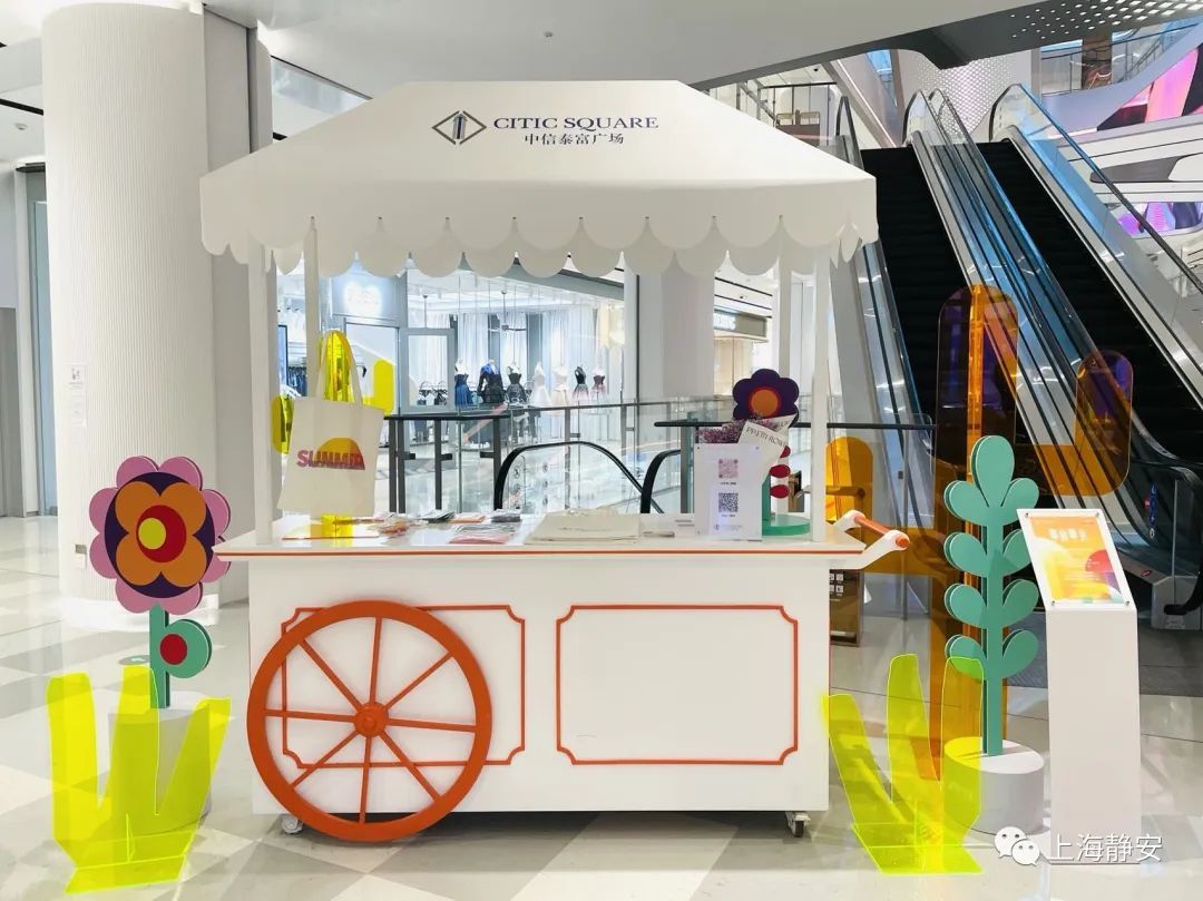 商场在1楼户外广场设有主题陈列装置,进入商场内有花车派赠夏日清凉福袋;