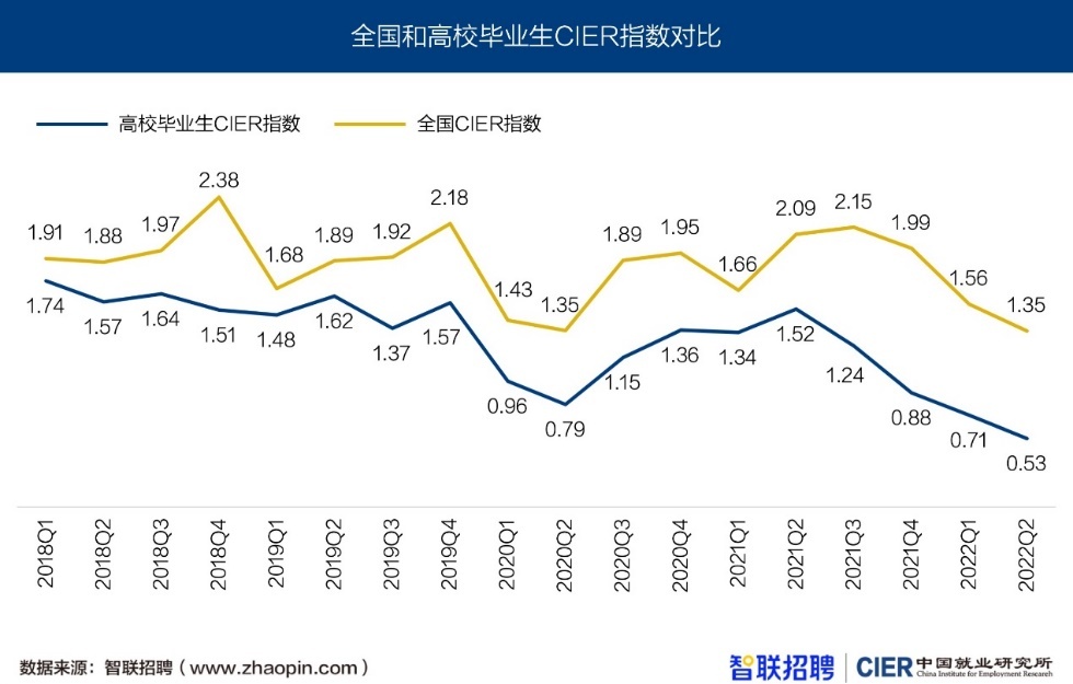 近日发布的2022年二季度《高校毕业生就业市场景气报告》显示,伴随局部地区疫情暴发对就业造成冲击,本季度高校毕业生CIER指数为0.53,继上季度以来,持续下降。分企业来看,疫情之下小微企业招聘需求受到冲击,大型企业需求缩紧,毕业生求稳心态使得国企“内卷化”加剧。
