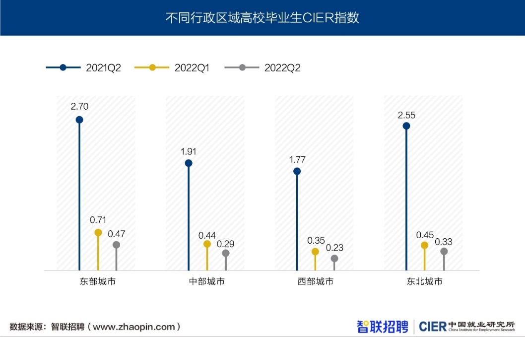 地域和城市是找工作时着重考虑的因素之一。从报告来看,本季度东部CIER指数相对较高,为0.47;中部、东北的CIER指数接近,分别为0.29和0.33;而西部相对较低,为0.23。从同比变动来看,东部城市招聘需求下降了8.7%,但中部、西部和东北城市招聘需求分别下降了25%、12%和31%。而供给方面,由于本季度毕业生基数较大,各地区的供给均有明显上升。