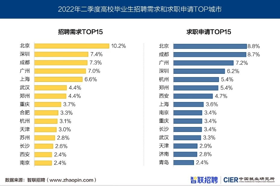 此外,随着新一线城市的快速发展,诸如成都、杭州、郑州、西安等新一线城市对毕业生的吸引力也在增加,济南、青岛亦上榜,这些城市的毕业生求职供给人数占比相对较多。