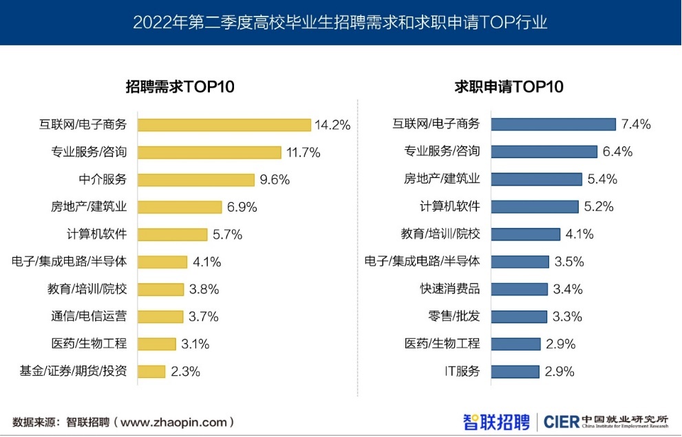 值得注意的是,中介服务、通信/电信运营、基金/证券业的需求占比较多,但这些行业毕业生供给占比相对较少。