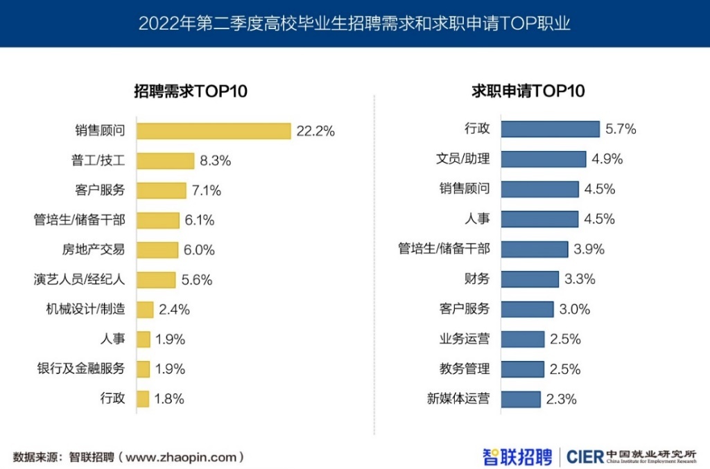 行业之下,高校毕业生更青睐于哪种岗位?从2022年二季度分职业就业形势来看,求职人数最多的职业为行政、文员/助理、销售顾问、人事、管培生/储备干部等。但招聘需求最多的职业为销售顾问、普工/技工、客户服务、管培生/储备干部、房地产交易等。