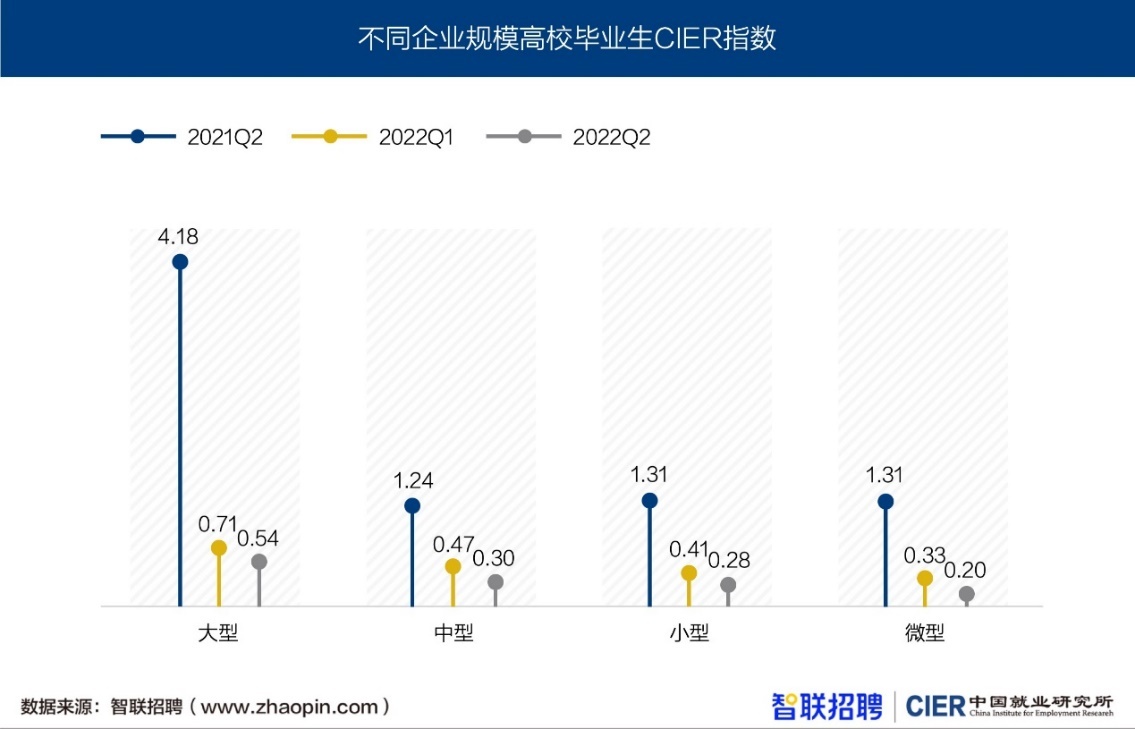 都是哪些企业在吸纳这些高校毕业生呢?报告显示,本季度不同规模企业的就业市场景气指数均处于低位,大型企业的高校毕业生CIER指数最高为0.54,其次是中型企业为0.30,小型企业和微型企业指数仅为0.28和0.20。