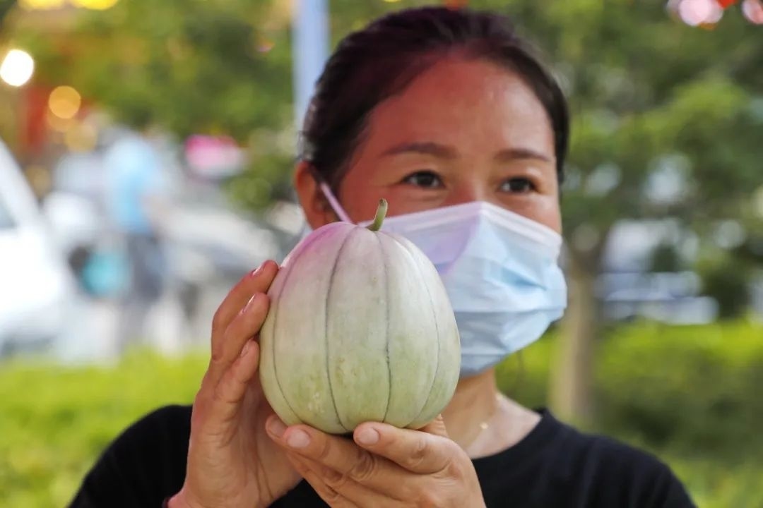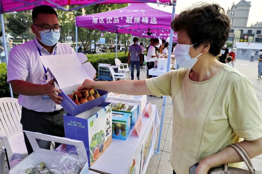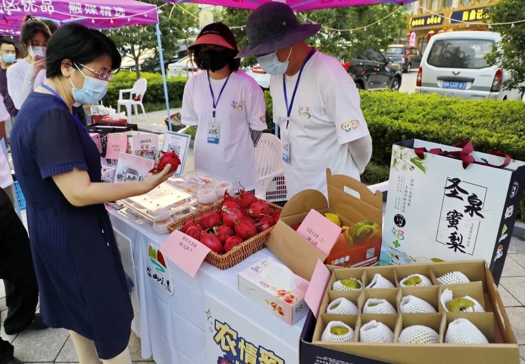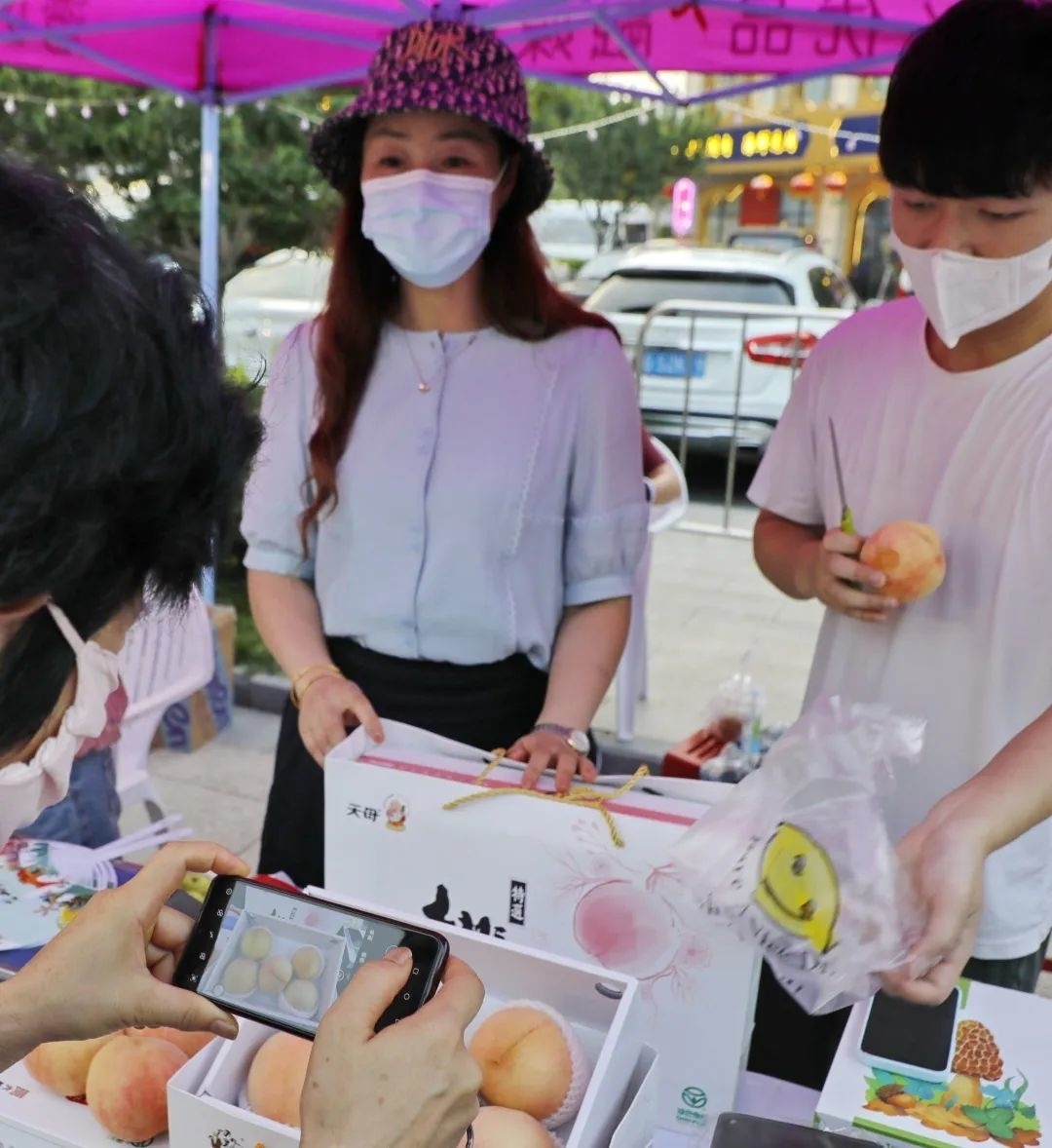 晚上6点,在金山区龙翔路818号金山区融媒体中心旗下的“融媒巷”文创基地的户外广场,金山各个街镇(高新区)纷纷设置展销展台,活动现场瓜果飘香,当季的蜜梨、火龙果、施泉葡萄、皇母蟠桃以及亭林雪瓜等特色优质农产品琳琅满目,吸引不少市民品尝选购。