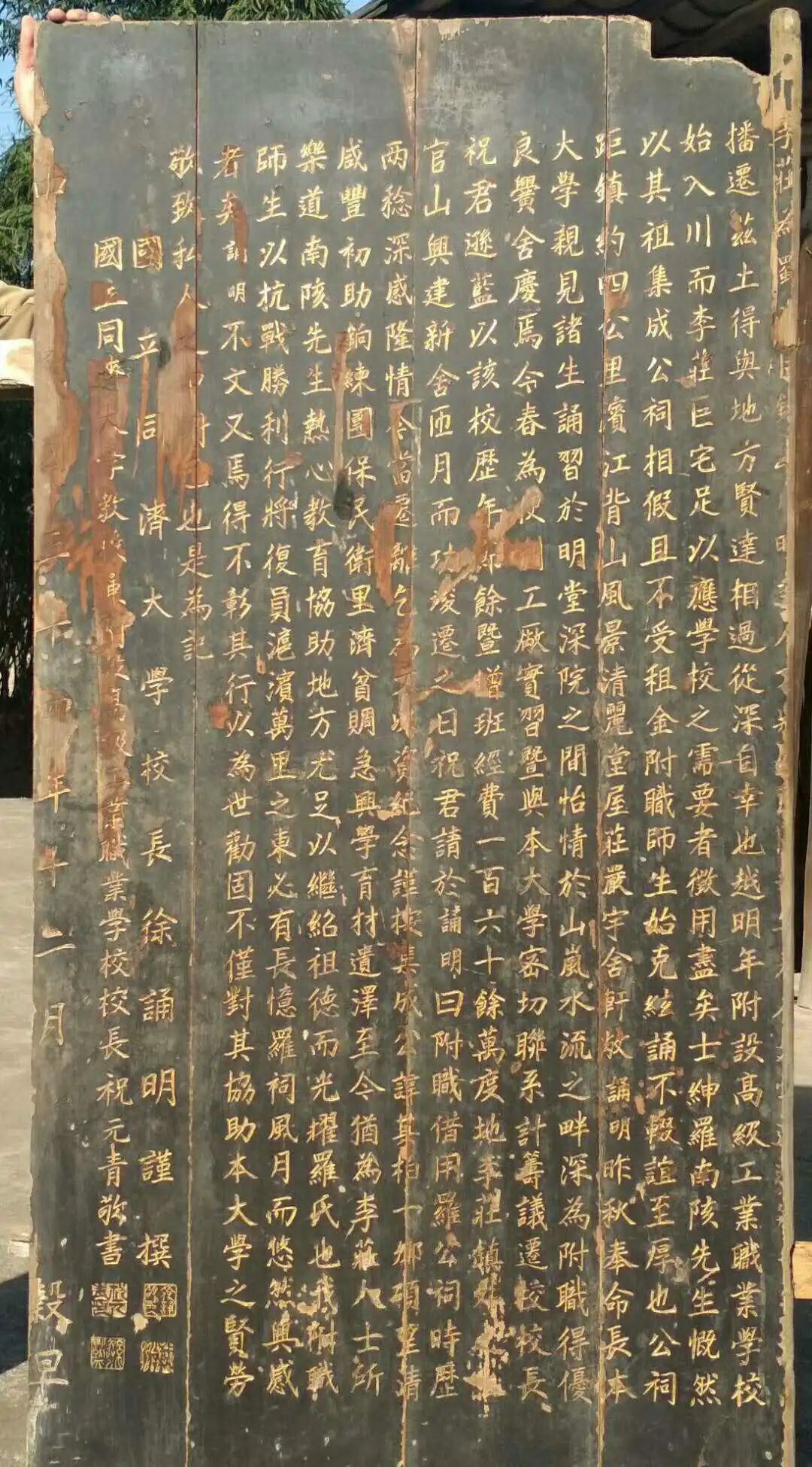那么,李庄有没有其他类似这样的木匾未被发现?教授郭世佑表示,“同济从李庄顺江返校之前,校长徐诵明等可能对工学院驻地东岳庙、医学院所在地祖师殿等均留有类似的文字。”郭世佑认为,正因为“同济大学李庄徐祝罗匾”是和“同济高工从罗家祠迁往上官山”这个特定的背景紧密关联的,而已有李庄同济史的相关研究表明医学院、工学院等在李庄期间院址未发生变更,所以类似的木匾在李庄也有可能只是个别的。何况,作为对李庄的整体答谢,1946年4月,同济在校本部禹王宫曾专门组织过一场隆重的离川公演。既然如此,这块木匾的价值就更加凸显了。