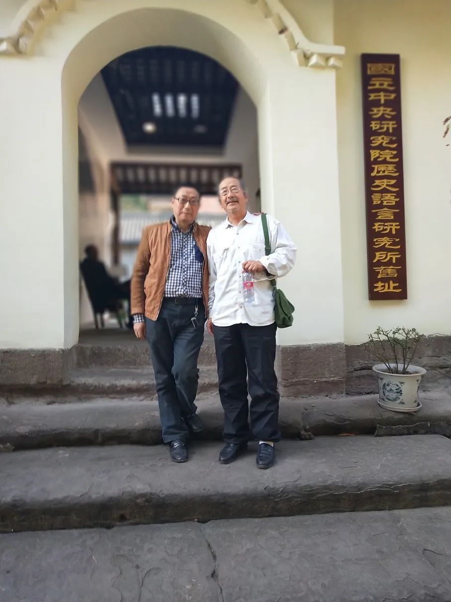 “同济大学李庄徐祝罗匾”主要发现者廖建麒(左)和逯弘捷(右)在国立中央研究院史语所旧址前合影