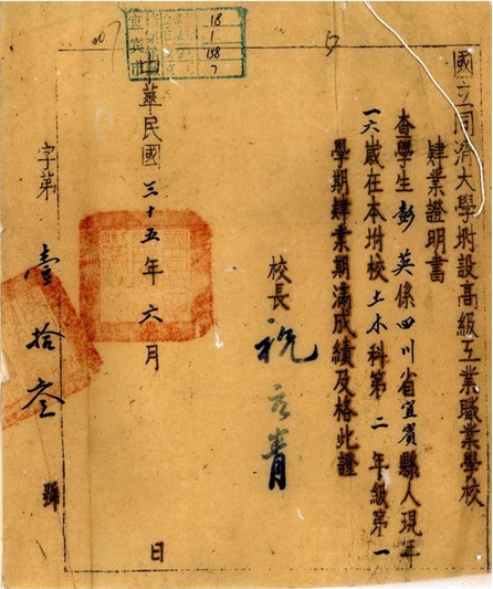 宜宾市档案馆藏祝元青1946年6月签发的同济大学附设高工毕业证书 宜宾市档案馆供图