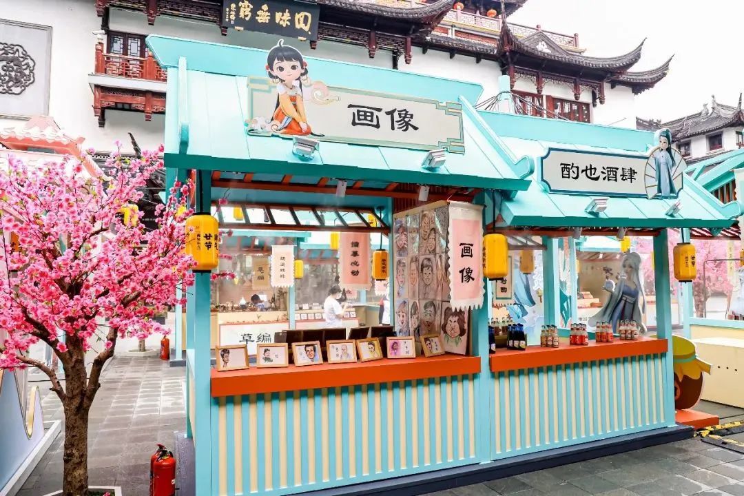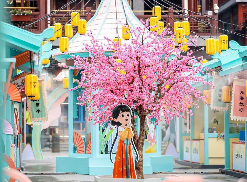 小铃铛跟阿巳同款约会桃花树穿越到豫园商城,你也可以在树下许下对爱情的期许。
