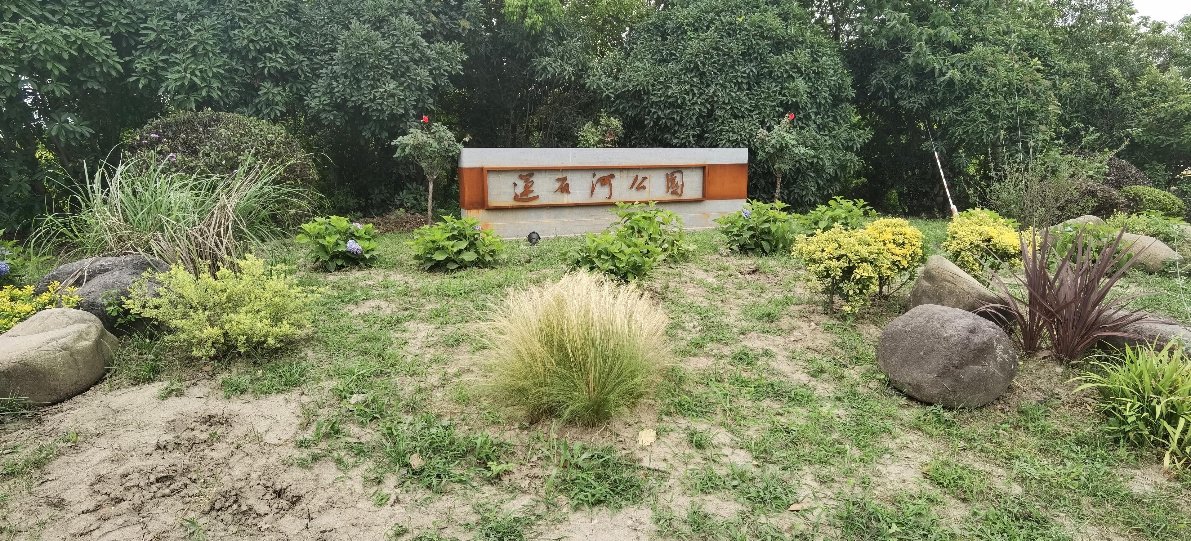 运石河公园位于奉贤区柘林镇,北临运石河,南至奉柘公路,西至南海公路,东至海湾路。公园整体面积约25000㎡,内有一条钢格栅步道连通东西,两侧树木高大,绿荫如盖。上午10点左右,公园内绿荫面积看起来可以达到80%以上。目之所及,是经过精心设计的乔木、灌木、地被植物和特色旱溪,层次分明,北侧的运石河流水潺潺,清风拂过,更是分外惬意。
