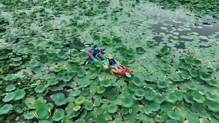 记者也体验了一下这彩色的平台舟,发现确实如工作人员所说,平台舟比较平稳,简易的操作对新手也十分友好。乘坐着小小的游船,穿梭于荷花莲叶之间,仿佛炙热的阳光都变得清爽温柔了许多,触手可及的莲花荷叶,让空气中飘来一丝清甜。远处的水面非常清澈,将蓝天白云,莲叶荷花和游客游船倒映在水中。此情此景,令人心旷神怡。