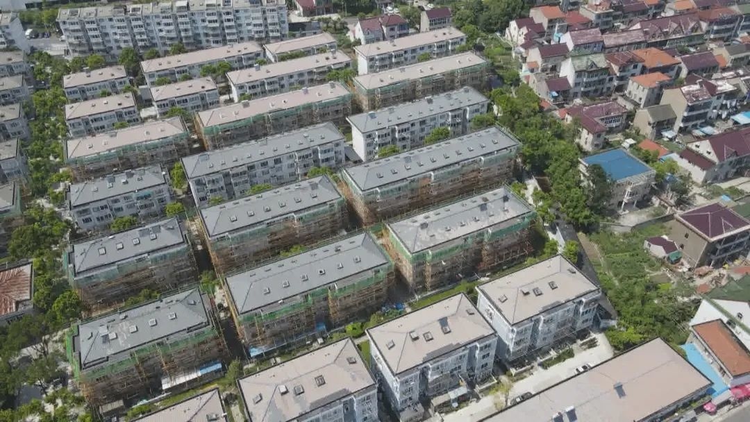 当天下午,记者在金山卫镇老西门花苑看到,主干道两侧的居民楼有的刚刚搭设起脚手架,有的已经施工完毕。项目负责人告诉记者,老西门花苑房屋普遍老旧,外墙预留排水管道不足。原先空调产生的水直接沿墙面而下,加剧了外墙的侵蚀和开裂。